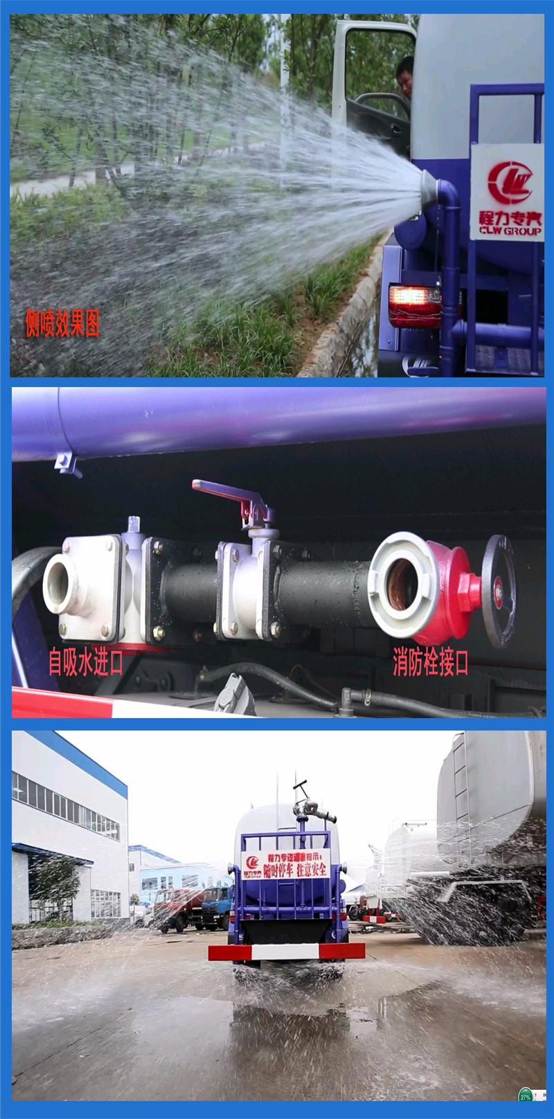 2.程力洒水车专用功能:垂直吸程>6米,洒水宽度>14米,射程>25米。洒水车前冲(能将路面泥巴、尘土、垃圾冲干净);后洒(能均匀地将水洒在路面,一次洒水宽度>14米)、前侧喷(花洒)