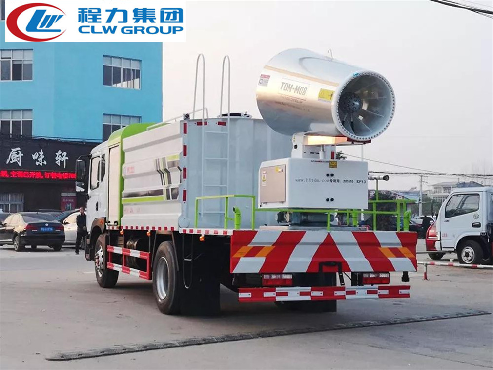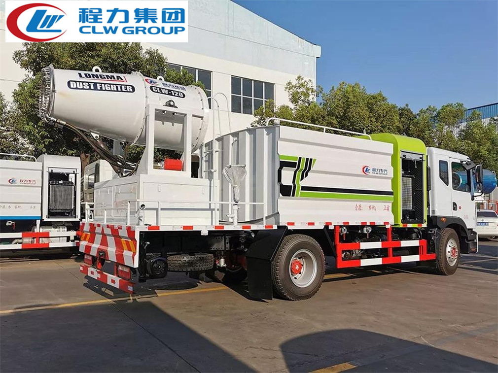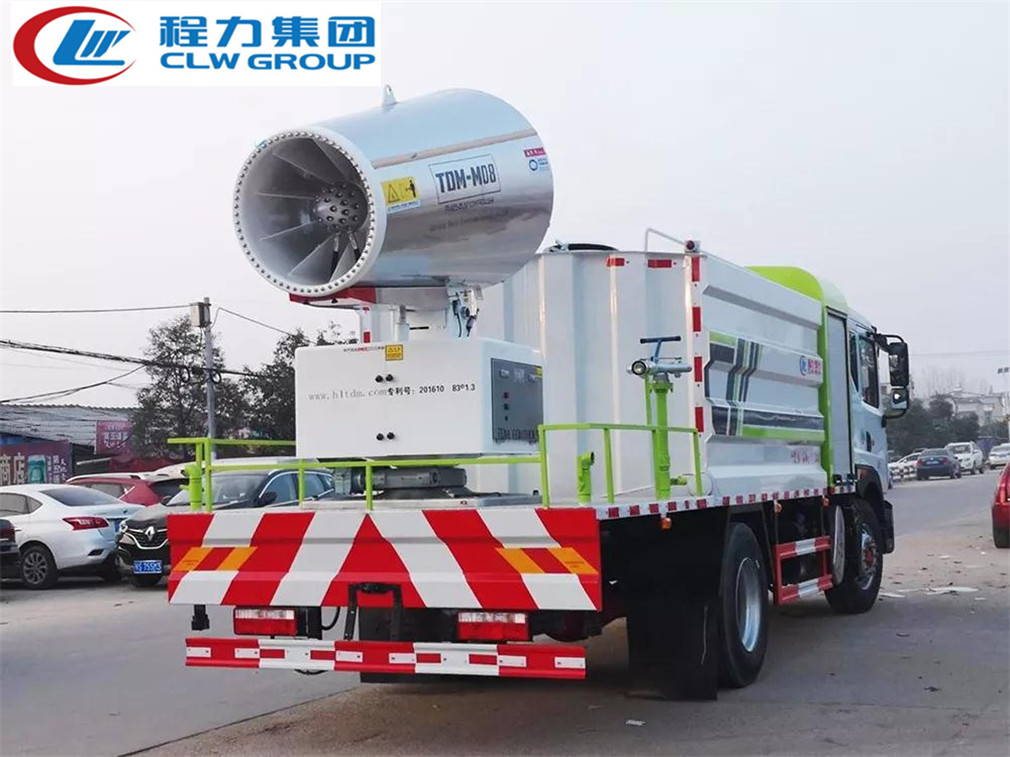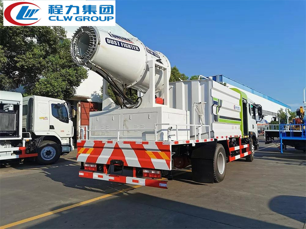 雾炮参数:尾部装高效率雾炮风机,副发动机功率为50kw,品牌可选潍柴、玉柴或康明斯,雾炮射程可达60-100米,覆盖面积可达13400-2000平方米,喷雾流量:50-150L/min,电子摇控操作,100米内可上下左右自动摇控喷雾,实现360度旋转。