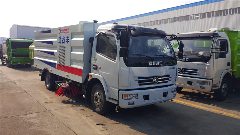 东风多利卡洗扫车,采用东风多利卡驾驶室底盘,朝柴156马力发动机,8.25R20钢丝胎,6档变速箱,4方水箱,5方垃圾箱,中置2扫盘、三洋马达、德国原装进口高压水泵(前冲侧喷中喷后喷雾侧冲洗车水枪垃圾箱自洁装置)、万向高压路沿清洗、低压泵前冲、不锈钢水箱、垃圾箱;不锈钢高压管路、施耐德控制开关、美国传感器;尾部LED箭头灯、机油、垃圾箱、水箱均带防溢或低水位报警装置;倒车及洗扫状态室内监视器、18m高压冲洗卷盘、最大清扫宽度3.5m。